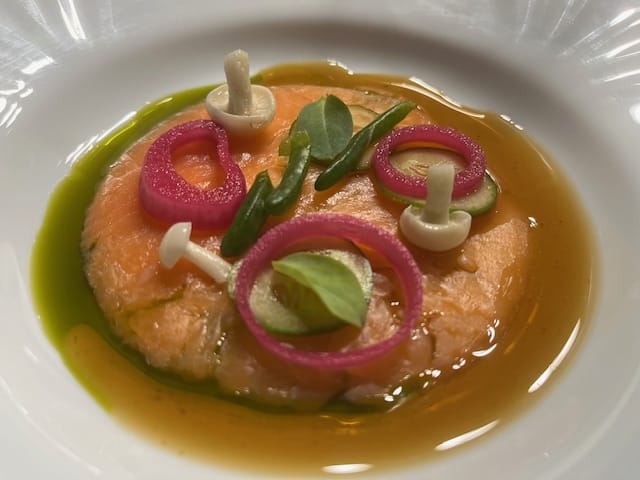 The dinner was bookended by two sparklers, Amadeu Laranja Nature Traditional Method 2020 and a Don Guerino Moscatel NV 2022, the former on the orange spectrum, the result of extended maceration, refreshing and surprising complex, the latter a sweetie with counterbalancing acidity, weighing in at just 7.5. per cent ABV.